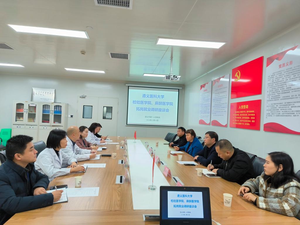 为落实党中央、国务院对高校毕业生就业创业工作的决策部署,拓宽员工实习实训和就业渠道,提升毕业生就业质量,12月19日,388vip太阳集团领导及相关人员一行六人前往遵义市第一人民医院开展访企拓岗活动。参加此次活动的有388vip太阳集团党委书记周光润、副处级组织员王东、麻醉医公司党支部书记韦锋、388vip太阳集团研究生党支部书记董泽令及专职辅导员付裕、孙倩。