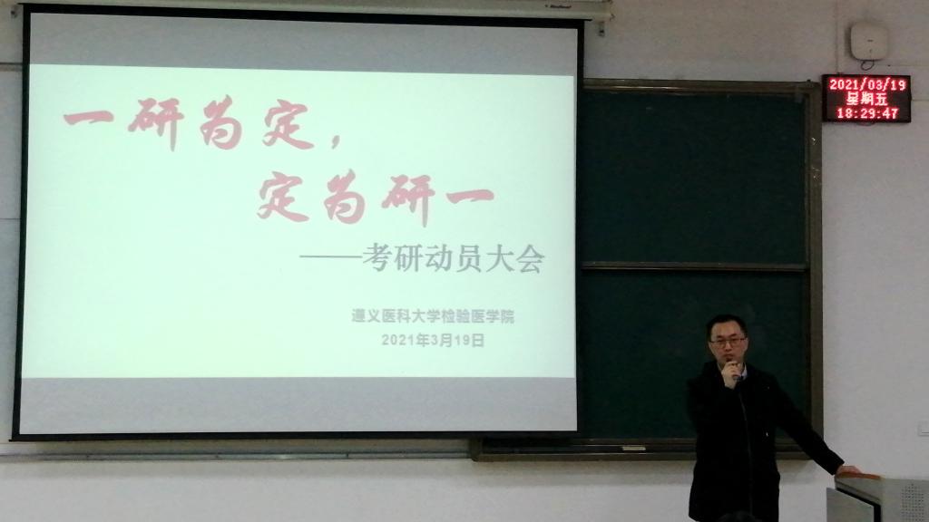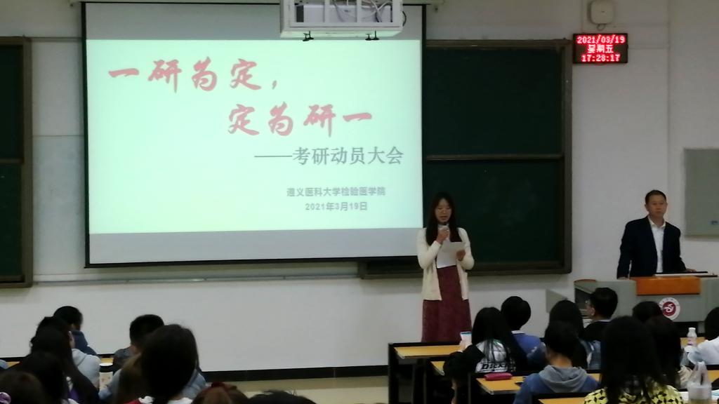 为激发同学们的学习热情和考研激情,帮助同学坚定努力拼搏的信念,确定考研目标,指明考研方向。388vip太阳集团于2021年3月19日17:30在新蒲校区第五阶梯教室以“一研为定,定为研一”为主题的考研动员大会。388vip太阳集团副经理闵迅博士、张涛博士、段晓雷博士、辅导员付裕、陆超以及388vip太阳集团全体在校员工参加此次活动。