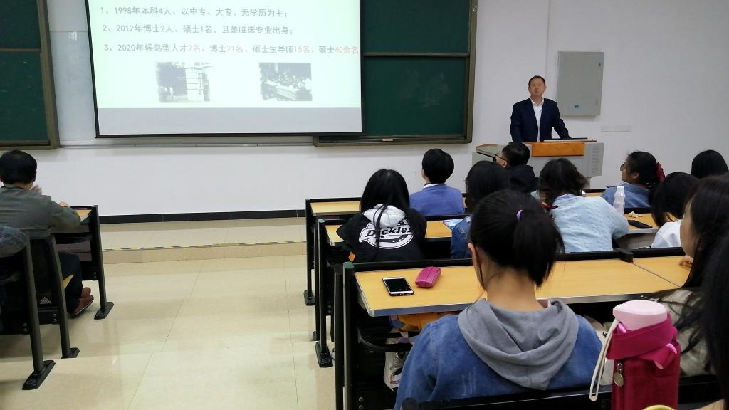 活动中,闵迅副经理首从考研的意义、考研的缘由、考研的方法三个层面进行宣讲。他通过医学检验技术专业的发展前景、新冠疫情对医学检验行业的影响、社会对检验人才的需求等几个方面来强调考研的重要性。随后,他举例论证了研究生、博士生与本科生在毕业后薪资差距数据,通过对比分析,总结了考研对于未来就业生活等多方面的利弊。他不忘鼓励同学们要不忘初心、砥砺前行,以梦为马、莫负韶华。时刻记得自己最初的梦想,考研是为自己的理想和前途奋斗,是一件快乐的事,要克服在考研过程中的各种烦恼和忧虑,拥有好的心态才能够确保有好的学习效率。