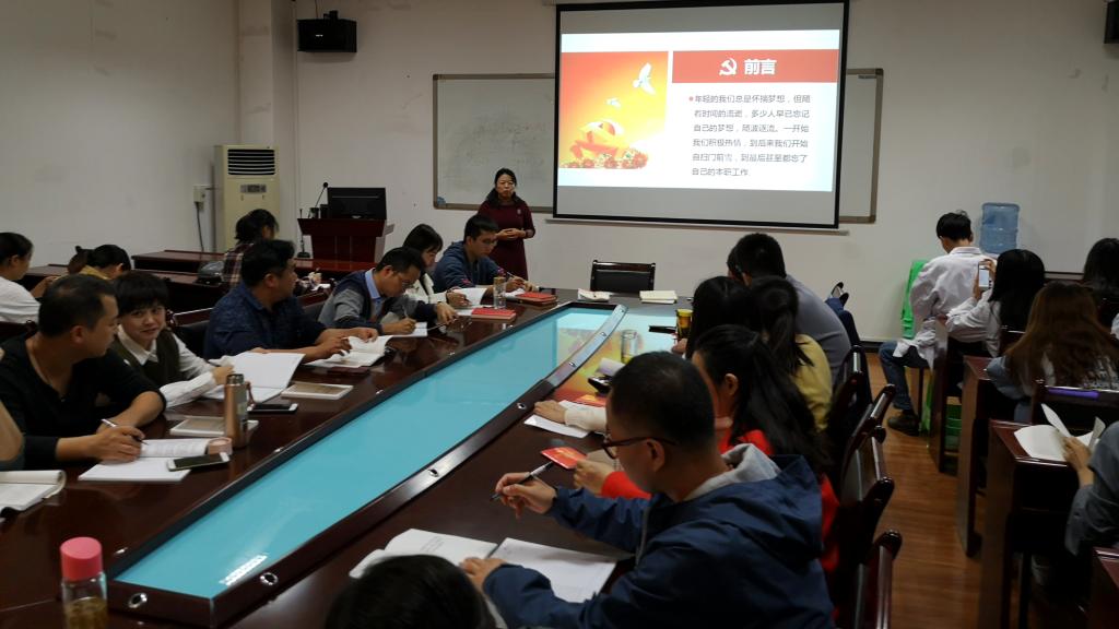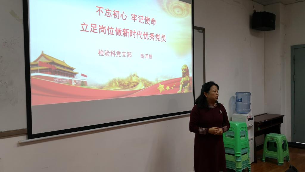 党支部书记陈泽慧以《“不忘初心,牢记使命”立足岗位做新时代优秀党员》为主题,围绕“什么是初心”、“悟初心”、“守初心”、“践初心”四个方面进行深入阐述。她从不同视角出发,以优秀共产党员80后乡村医生贺星龙的感人事迹以及自己的学习体会,深刻诠释了新时期共产党员为中国人民谋幸福、为中华民族谋复兴的初心和使命。