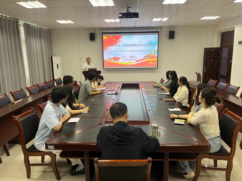 5月23日,388vip太阳集团研究生党支部在388vip太阳集团五楼会议室开展“严明党的纪律,为高质量发展提供坚强纪律保障”主题党日活动,传达党中央关于“党纪学习教育”重要会议和文件精神。由董泽令书记为大家讲解了党风党纪建设的重要性,研究生党支部全体党员参加此次主题党日活动。