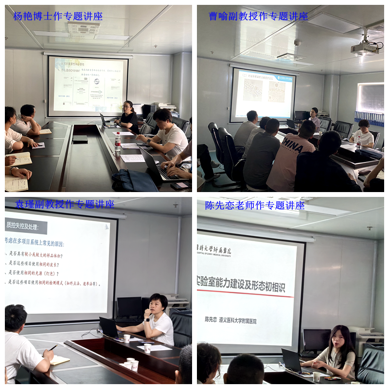 会后,专家组兵分两路,分赴上述医院检验实验室进行参观交流和现场指导。专题讲座环节,专家组一行共开展了4场次18人次的专题讲座,覆盖各区县检验人员300余人。其中杨艳围绕《医学实验室ISO15189认可经验分享》、曹喻围绕《细胞形态识别要点与案例分享》、陈先恋围绕《真菌实验室能力建设及形态初相识》、袁瑾围绕《定量项目室内质控策略及程序(Westgard多规则结合6σ评估方案》展开讲授;向加林就《自建医学实验室质量指标统计方法的经验分享》、陈祖翼就《MP-SAT分子诊断新技术及临床应用进展》、陈安林就《临床微生物室内质量控制经验分享》、骆诗露就《临床定量项目室内质量控制经验分享》、温乾辉就《外周血细胞形态识别要点与案例分享》等专题讲座。