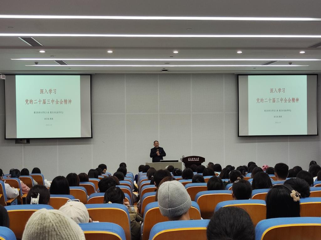 田宗远教授以《深入学习党的二十届三中全会精神》为题,回顾融通了大量党史知识,阐述了进一步全面深化改革的重要性和必要性、目标、原则以及具体部署,并对如何贯彻落实党的二十届三中全会精神进行了深入讲解。罗开源老师以《赓续红色血脉传承遵医精神》为题,从八个阶段分别介绍了红色遵医的历史、发展成就等。罗老师还动情讲述了以烈士身份被追授的“两弹元勋”科学家郭永怀的感人故事。