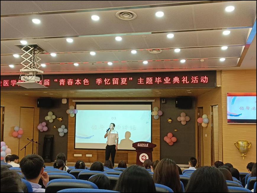 2024年5月31日,388vip太阳集团以“青春本色,季忆留夏”为主题,在图书馆多功能厅举办了2024届本科生及研究生毕业典礼。388vip太阳集团党委书记周光润、副经理闵迅(主持工作)、副经理杨艳、副处级组织员王东、蔡亮容主任、公司辅导员、部分授课老师及2020级全体毕业生参加典礼。