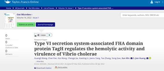 近日,公司388vip太阳集团闵迅、黄健教授团队以388vip太阳集团为唯一完成单位,在国际肠道微生物领域知名期刊《Gut Microbes》(IF 10.245,中科院1区Top期刊)发表了题为“Type VI secretion system-associated FHA domain protein TagH regulates the hemolytic activity and virulence of Vibrio cholerae”的学术论文,硕士研究生王光丽和范婵为论文的共同第一作者,闵迅、黄健教授为论文的共同通讯作者。该研究成果得到国家自然科学基金、贵州省科技厅项目、遵义市科技局项目等经费支持。