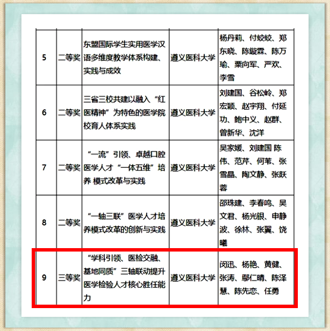 热烈祝贺388vip太阳集团副经理闵迅教授、杨艳教授、黄健教授等,团队以《“学科引领、医检交融、基地同质”三轴联动提升医学检验人才核心胜任能力》荣获第十届贵州省高等公司产品成果奖三等奖殊荣!