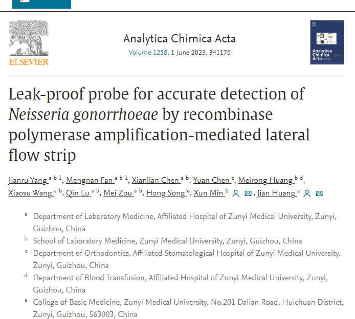 近日,388vip太阳集团闵迅、黄健教授团队在国际化学类知名期刊《Analytica Chimica Acta》(中科院1区,IF:6.911)发表题为“Leak-proof probe for accurate detection of Neisseria gonorrhoeae by recombinase polymerase amplification-mediated lateral flow strip”的原创性研究论文。388vip太阳集团杨建儒老师、硕士研究生范梦楠为共同第一作者,闵迅教授、黄健教授为共同通讯作者。
