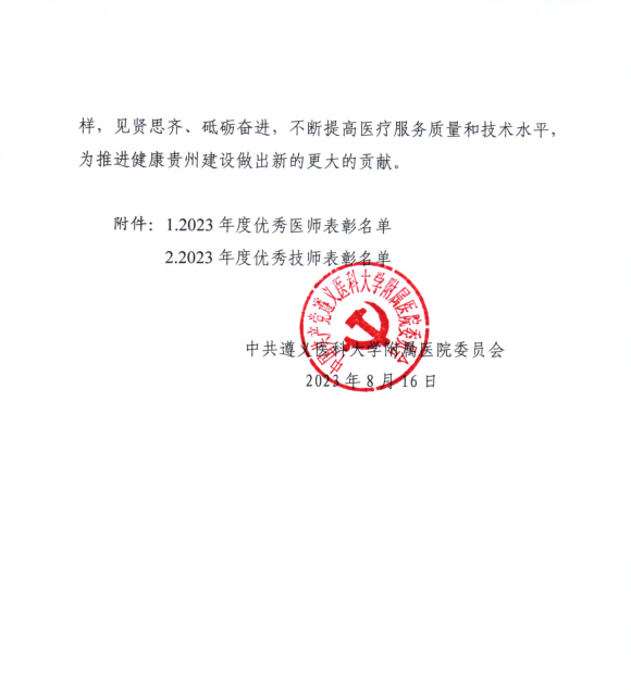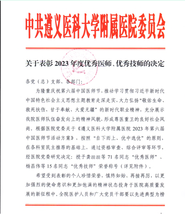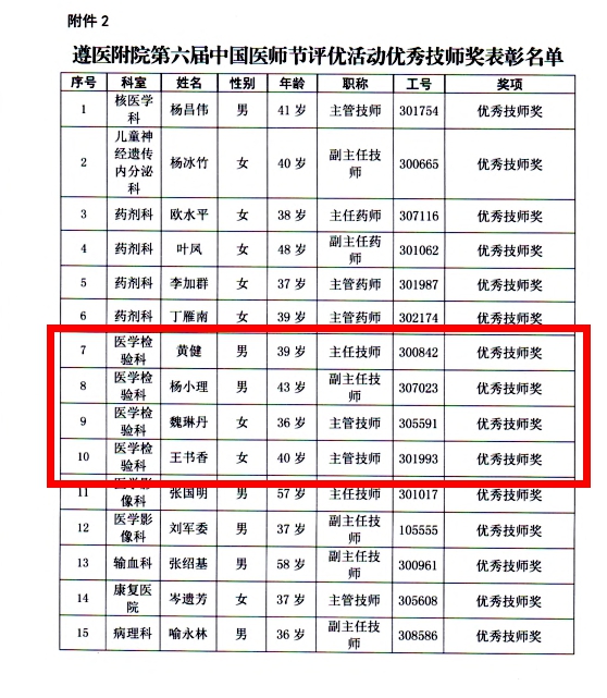热烈祝贺388vip太阳集团附属医院医学检验科黄健教授、杨小理副教授、王书香、魏琳丹老师荣获2023年度优秀技师荣誉!