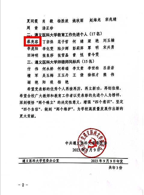 喜 报-公司闵迅教授、蔡亮容副教授分获公司表彰