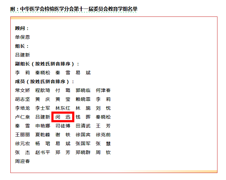 喜 讯!热烈祝贺闵迅教授当选为中华医学会检验医学分会第十一届