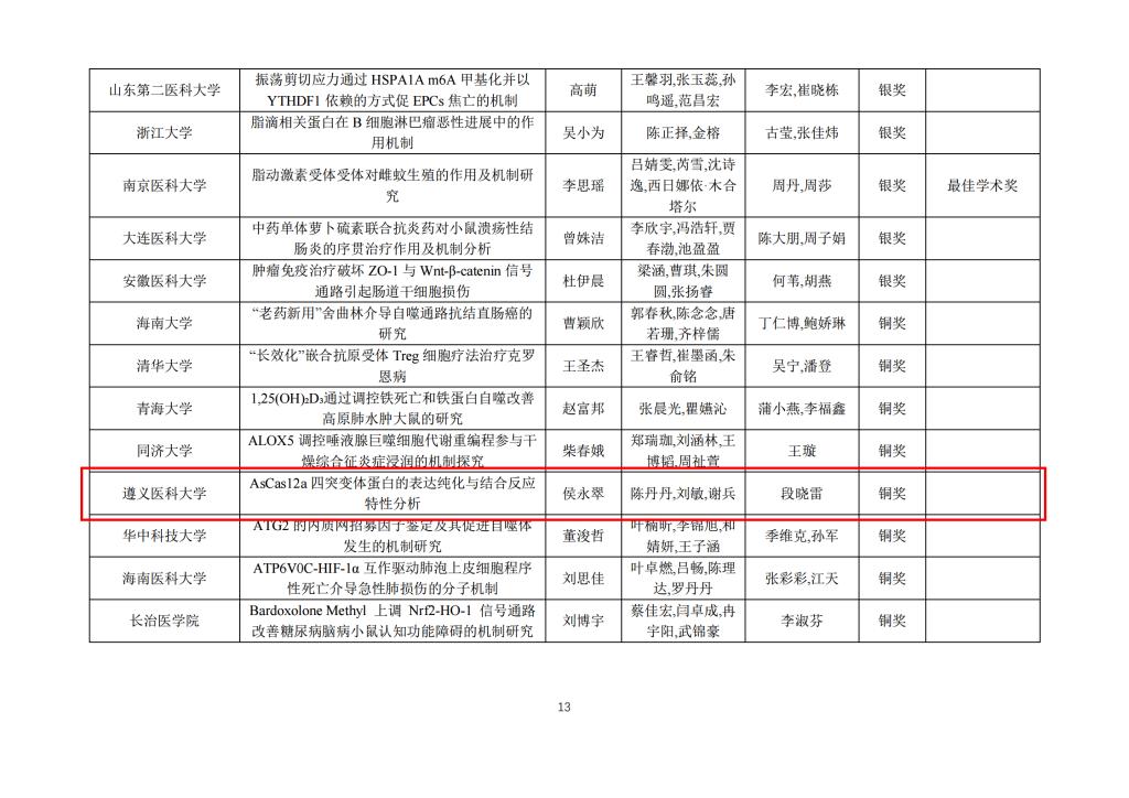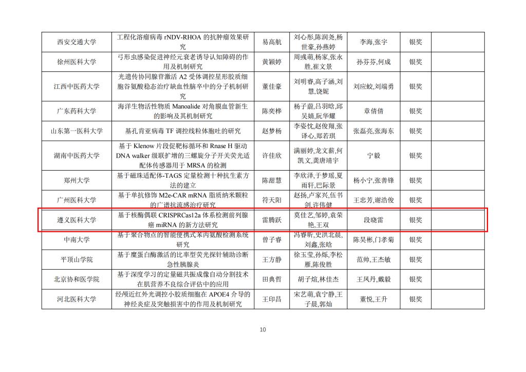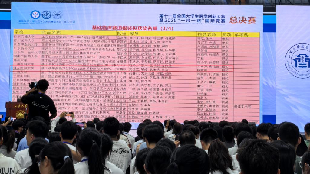 其中:雷腾跃小组(成员:莫佳艺、邹婷、袁荣艳、王双)凭借项目《基于核酶偶联CRISPR Cas12a体系检测前列腺癌miRNA的新方法研究》,建立高灵敏、高特异性的分子诊断新策略,为前列腺癌早筛提供新方案,获银奖1项侯永翠小组(成员:陈丹丹、刘敏、谢兵)围绕基因编辑工具结构优化,完成《AsCas12a四突变体蛋白的表达纯化与结合反应特性分析》,显著提升基因检测体系的效能与稳定性,获铜奖1项