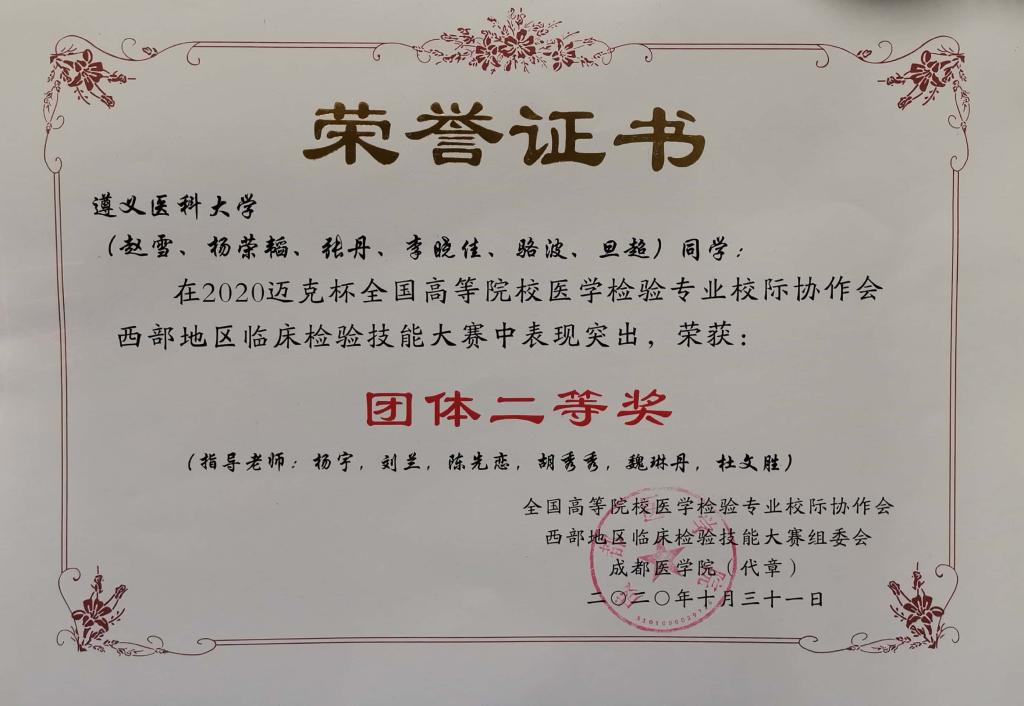 赛事准备以来,公司领导高度关心和重视此次大赛,赛前由闵迅副经理组织相关专业具有丰富临床经验的魏琳丹、陈先恋、袁瑾、刘兰、杜文胜、杨小理、曹喻、段晓雷、胡秀秀、杨宇等老师成立指导教师团队,积极开展参赛队员筛选、培训和考核工作。最终选派6名老员工队员参赛,分三人一组,共两组,并在大赛中荣获团体二等奖的佳绩。此外 ,二队队员骆波、李晓佳、旦超3名同学荣获四川省高校老员工临床检验技能大赛二等奖;一队队员赵雪、杨荣韬、张丹同学荣获四川省高校老员工临床检验技能大赛三等奖。以赛促学,公司参赛团队继上次赛事后,成绩更进一步,充分体现出了公司对医学检验技术专业老员工技能训练的重视,也标志着公司教师团队的公司产品质量在一步步的提升。