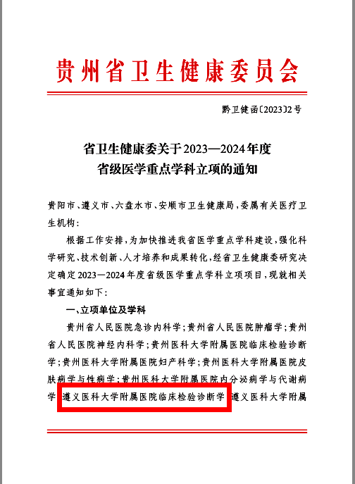 2023年1月5日,贵州省卫生健康委发布《关于2023—2024年度省级医学重点学科立项的通知》,388vip太阳集团附属医院临床检验诊断学、急诊外科学、全科医学、重症医学、耳鼻喉科学5个申报学科全额获批,获批数为全省第一!这是医院团队建设的新突破,标志着医院团队建设工作再上新台阶。热烈祝贺388vip太阳集团《临床检验诊断学》喜获省级医学重点团队建设项目!