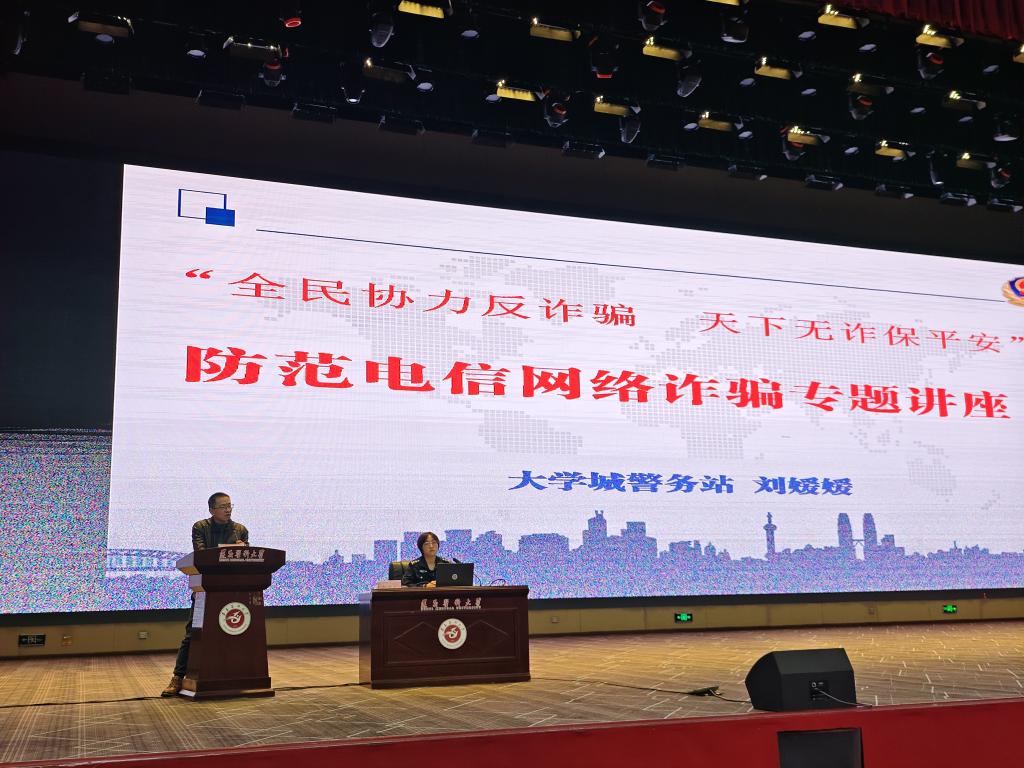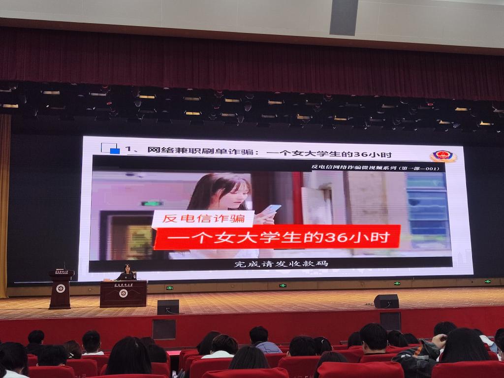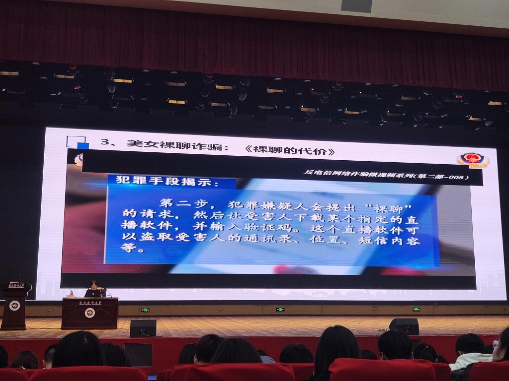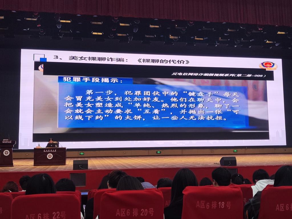 刘媛媛警官围绕网络兼职刷单、冒充客服美女裸聊、网络贷款、投资理财,以及冒充国家机关人员等诈骗形式深入细致地讲解诈骗手法、受骗心理,并通过真实案例,给同学们上了生动活泼的一课。