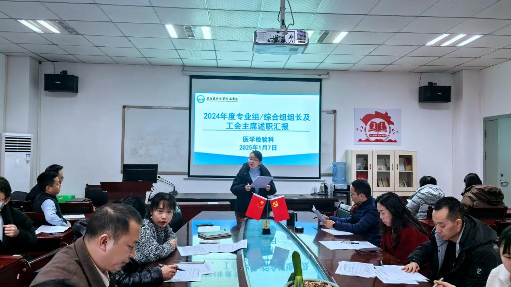 2025年1月7日下午3点,388vip太阳集团附属医院医学检验科在门诊六楼会议室召开2024年度各专业组和综合组组长年终考核述职。本次述职遴选科室管理层及职工代表共19人作为评委,由14名各专业组、综合组组长、工会主席以6分钟PPT形式进行汇报。会议由医学检验科副主任杨艳博士主持。
